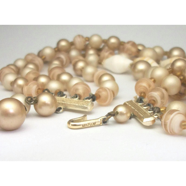 This vintage 1950s four strand beaded necklace features glass and plastic beads in various shapes and sizes. The hook clasp and extender allow the shortest strand to be worn at lengths of 15" to 17 3/4" (38 to 45 cm). The beads are shades of beige with hints of gold and tangerine orange. The necklace is marked Japan on the hook clasp. It's in excellent vintage condition. Beautiful piece!