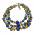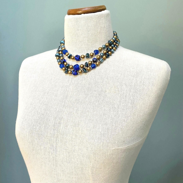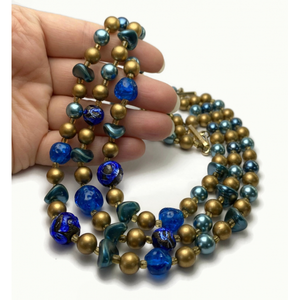 Vintage Blue and Bronze Beaded Choker Necklace Triple Strand Made in Japan 1950s 50s