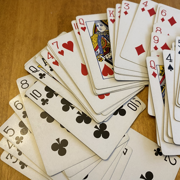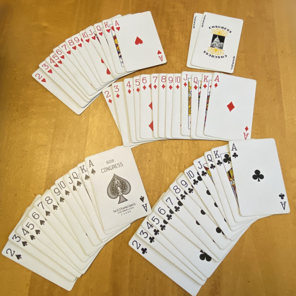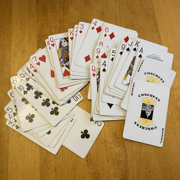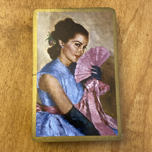 This vintage Congress brand deck of standard bridge playing cards features a Spanish lady with a lace fan. The cards are in very good gently used vintage condition and are still very crisp with just minor signs of use. The deck is complete and has two jokers, and the cards have a gold edge.