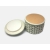 This vintage round floral trinket box is a soft green color with a basketweave design, and the lid has white, blue and lavender daisies or similar flowers. The material seems to be a type of resin, and the box measures 2 5/8" in diameter and 2 3/8" tall. It's in excellent vintage condition with no chips, and the inside is nice and clean as well.