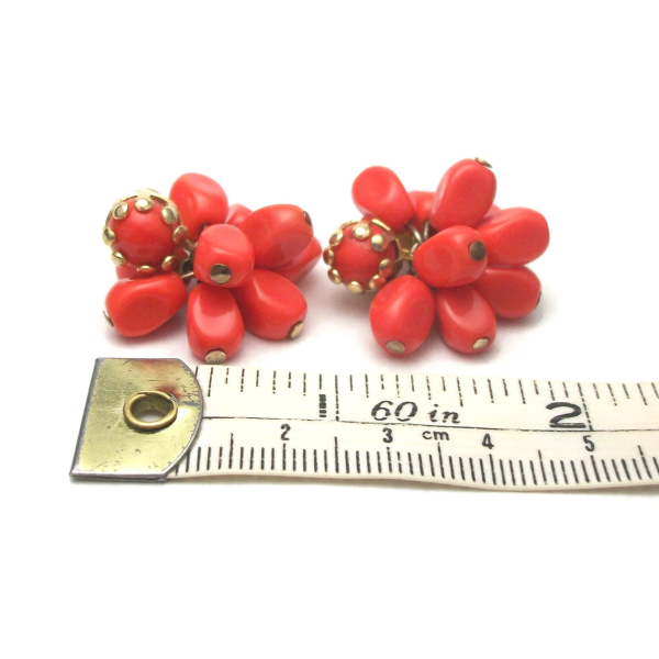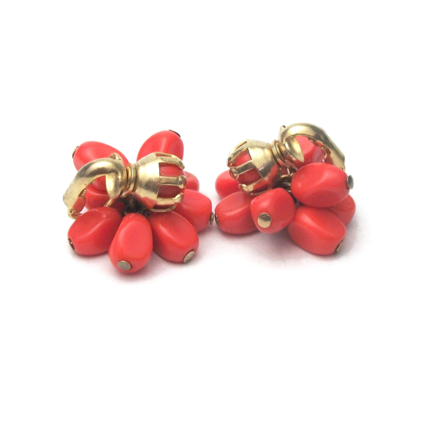 These beautiful bead cluster clip on earrings feature coral colored orange acrylic beads with gold tone metal. They measure 1" x 1" (2.5 x 2.5 cm) and are in excellent vintage condition. The clips work well and the earrings have a little bit of fun and flirty movement with the dangling beads.