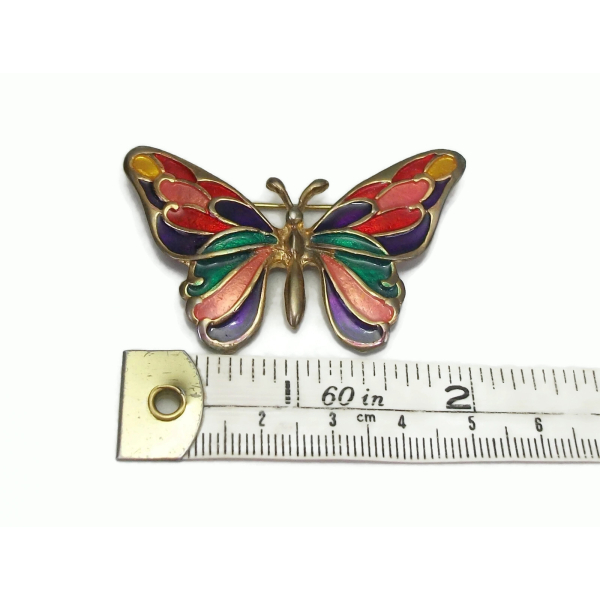 This colorful vintage butterfly brooch is gold tone with purple, red, pink, gold, and green enamel. It has some expected metal discoloration from age but is still in very good vintage condition. It measures 2 1/8 x 1 1/2".