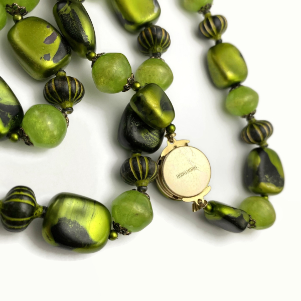 This vintage 1950s-1960s necklace featured green apple and black beads in various shapes, with filigree endcaps. It measures 28" long and has a box clasp closure that works well. The back of the clasp is signed Hong Kong. The necklace is in very good vintage condition. To view the rest of my available items, click on 'STORE' above.
