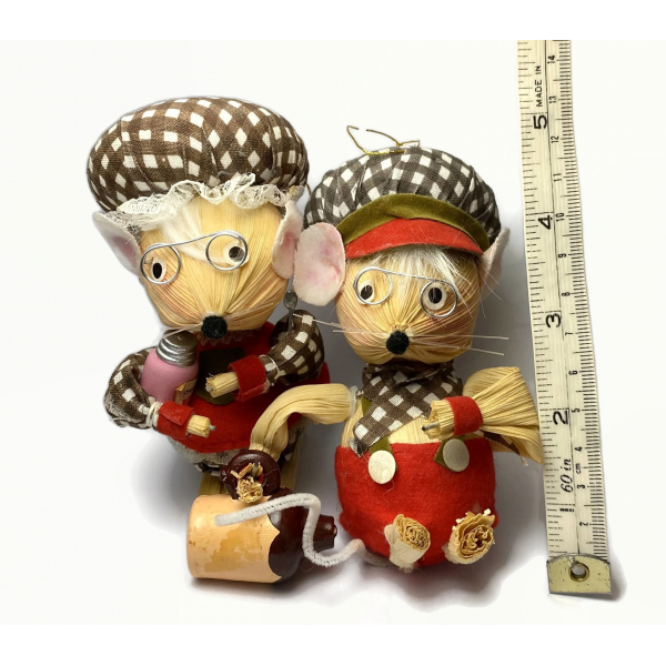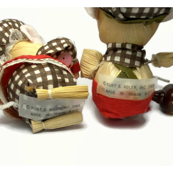 This is a pair of vintage 1983 Kurt S. Adler corn husk mice ornaments, one with a jam jar and one with a cider jug. Please note the cider jug once had a sticker that is no longer on it. Other than that they're in great gently used condition with no notable damage. To view the rest of my available items, click on STORE above.