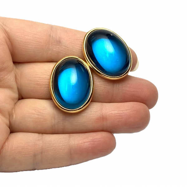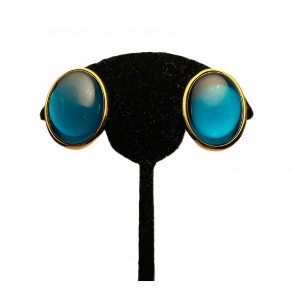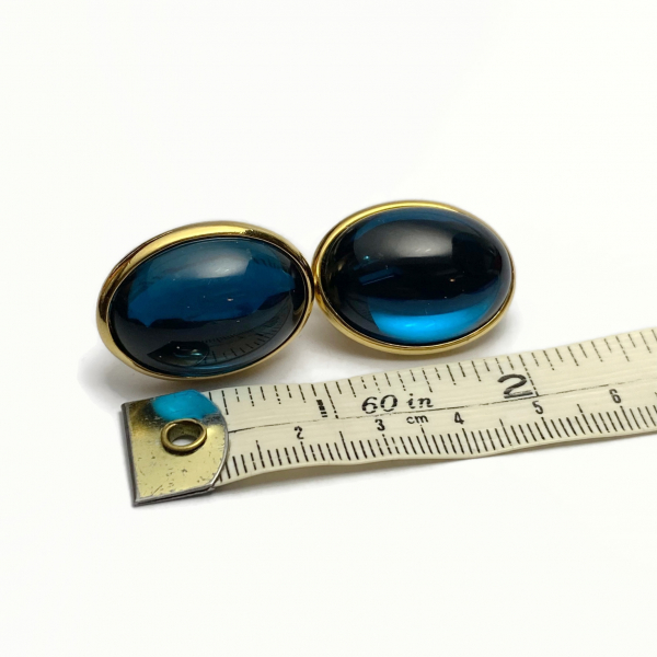 Vintage Trifari Teal Glass Clip on Earrings Gold with Oval Teal Blue Cabochons